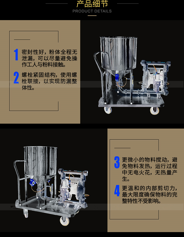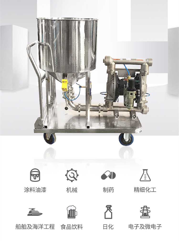粉體氣動隔膜泵是用來輸送固體粉末狀物料的,與輸送液體的隔膜泵還是有較大的區別。固體粉末狀物料只有在保持半流動狀態下,才不至于在泵腔體內被壓縮成近似固體的塊狀導致輸送失敗和損壞泵。因此,用于輸送液體的普通雙隔膜泵是無法正常用于固體干粉輸送的。粉體氣動隔膜泵系統需增加一組特殊的閥,在每個泵循環中,根據一定的時間順序,將壓縮空氣(或其他的惰性氣體)同步引入泵的腔體,使在粉體的泵送過程中保持流動狀態。