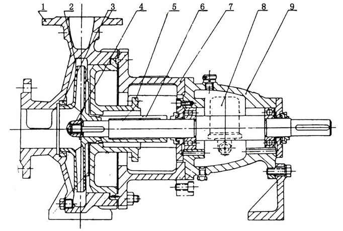 1 泵體 2 葉輪 3 密封環 4 葉輪螺母 5 泵蓋 6 密封部件 7 中間支架 8 軸 9 懸架部件